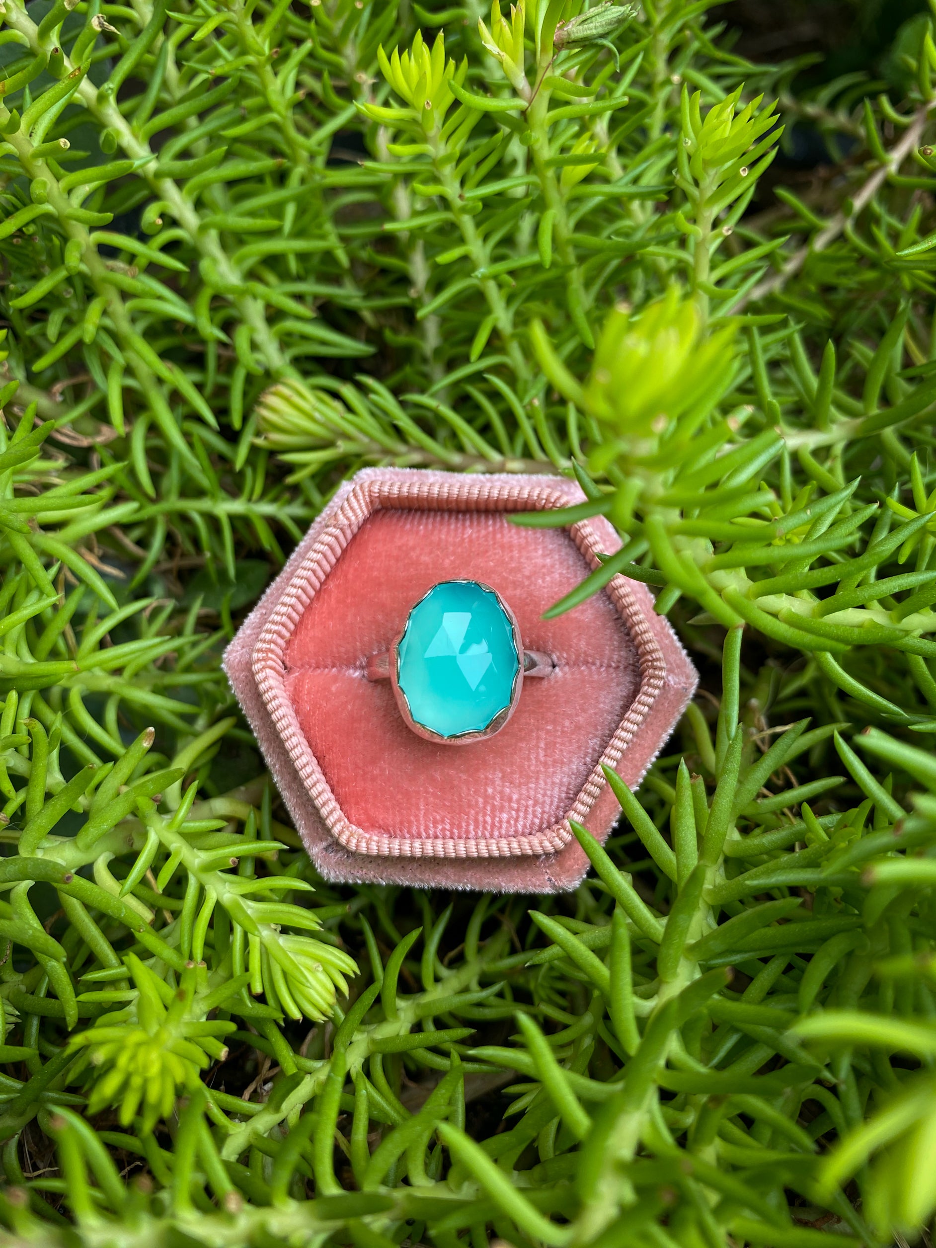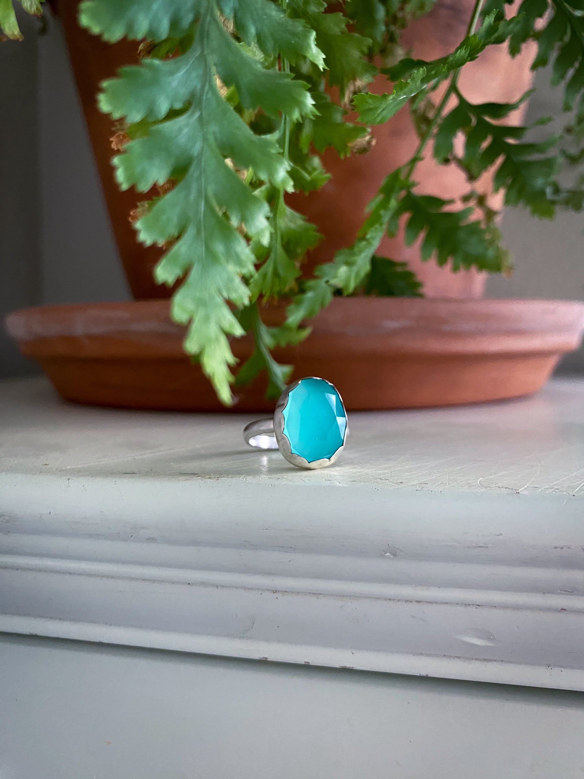 This faceted aqua Chalcedony gemstone shines brightly in a scalloped sterling silver setting. When the sun hits this ring, the color reminds me of swimming in the warm, turquoise waters of Cuba. Lightweight and ready to travel with you on all of your adventures.