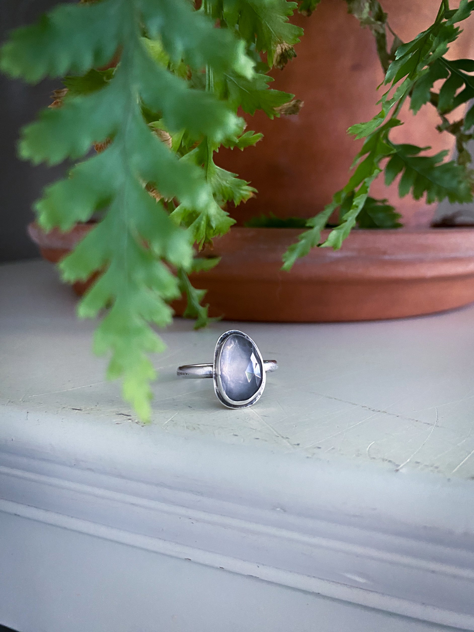 Rosecut Rose Quartz sits in stamped silver to add a little sparkle to your everyday.