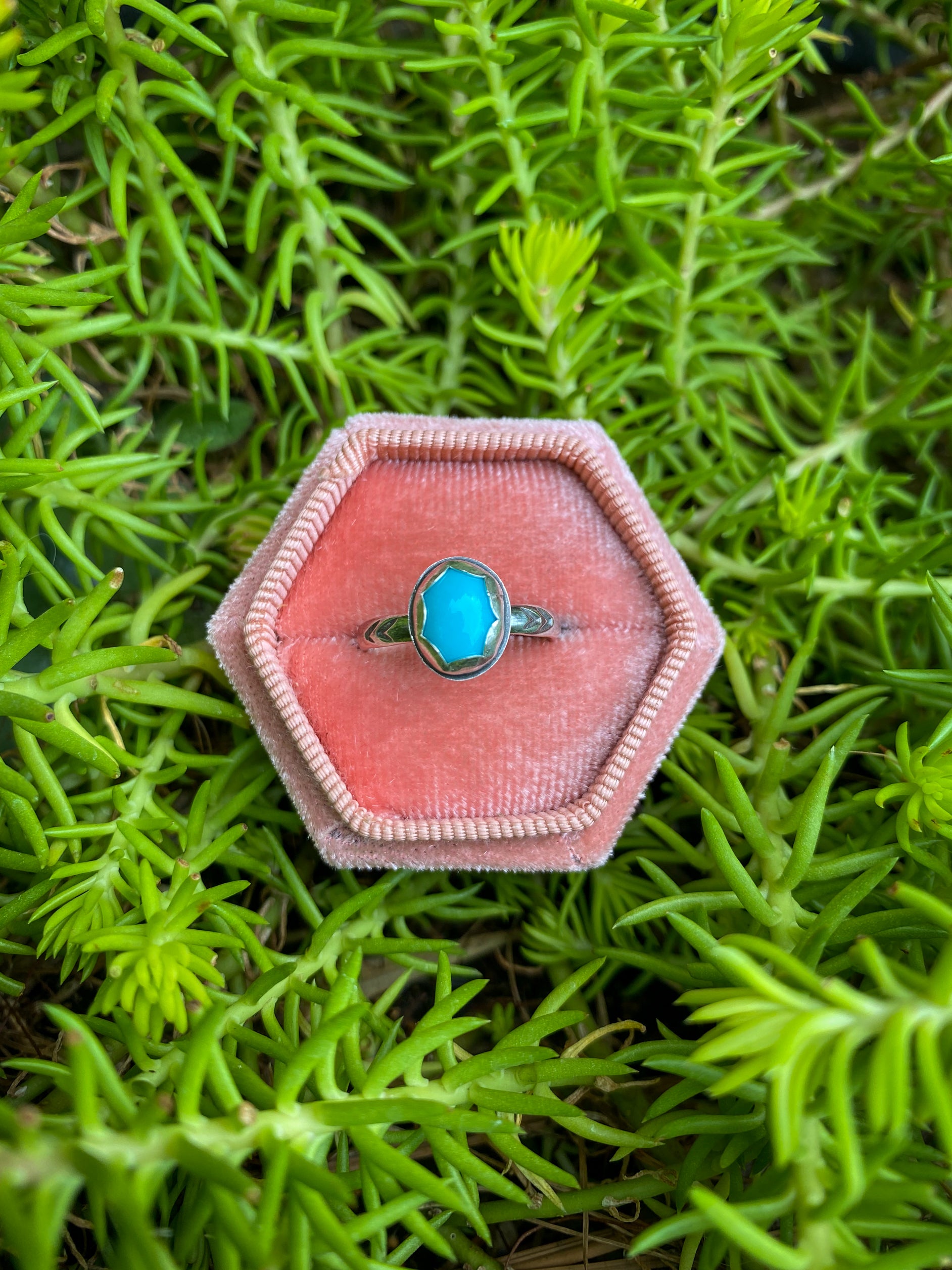 A unique ring with a scalloped setting and stamped band. This one is for all of you who have been asking for Turquoise rings with a quieter vibe. I present to you... The Tiny. The magic of Turquoise without the heft. An everyday friend that you'll never take off.